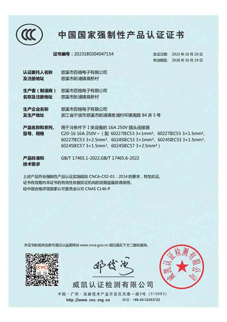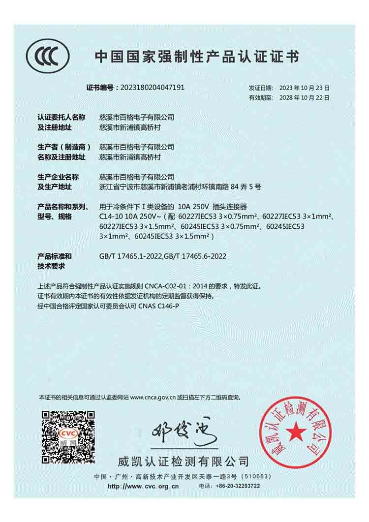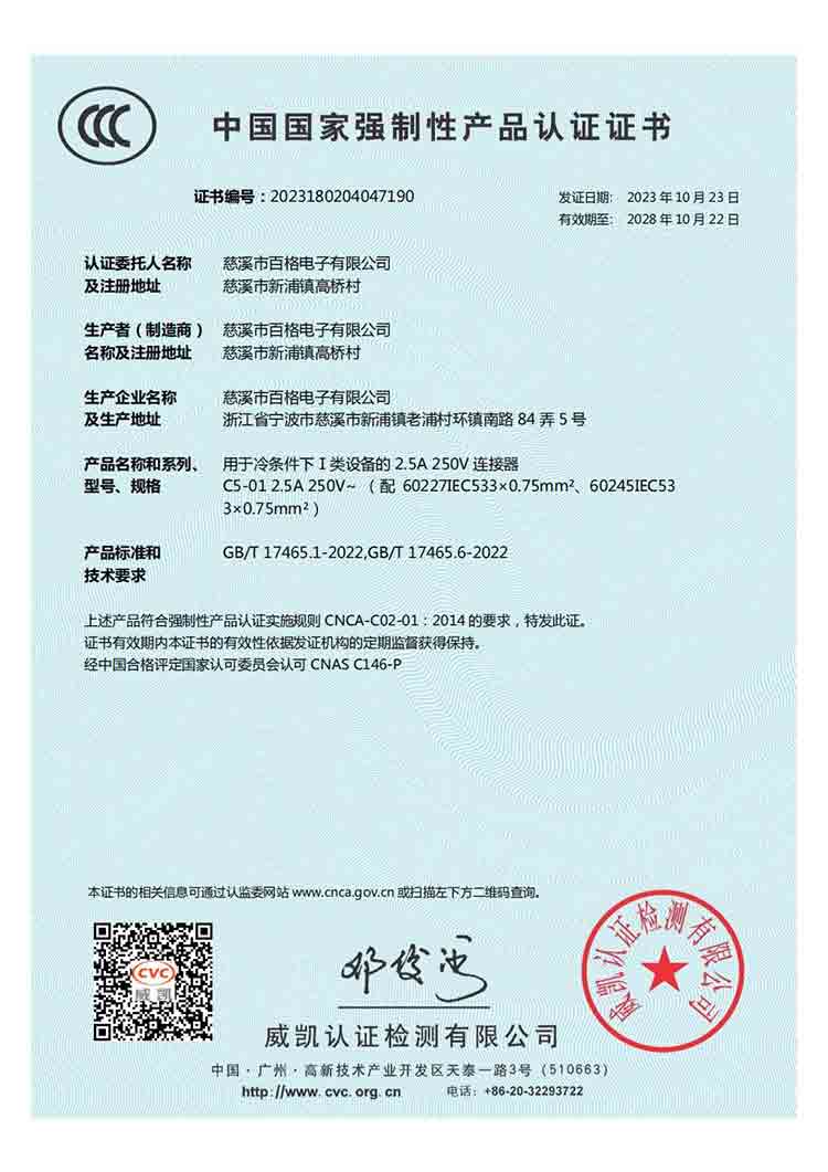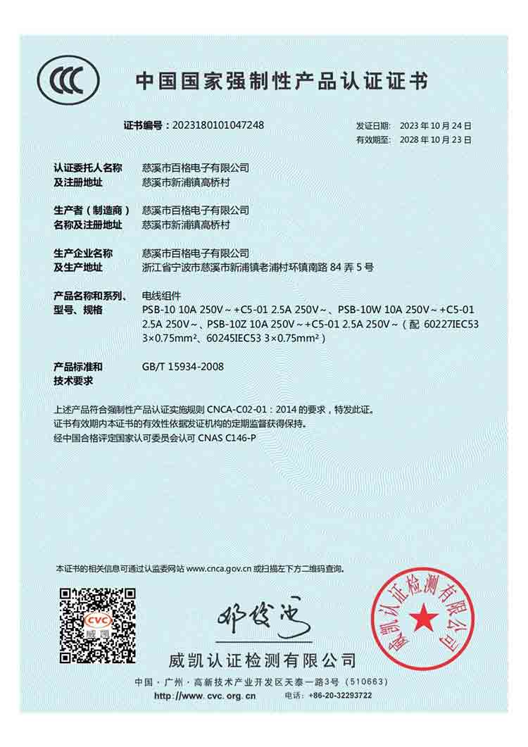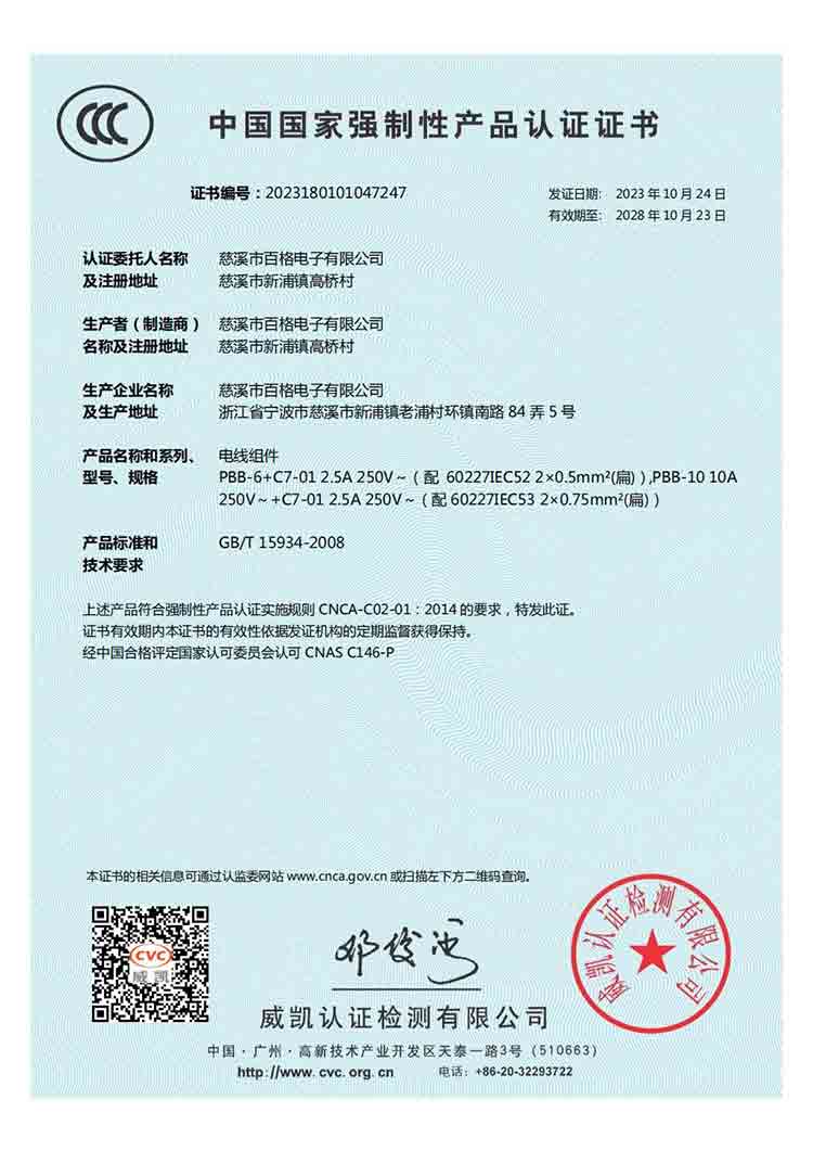 百格電子自成立以來,一直堅持質量第一、服務至上的忠指服務于廣大客戶。近期,我公司已將一些比較冷門的產品全部申請了CCC產品質量認證,至此,我公司國標電源線系列產品CCC產品認證全齊了。